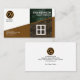 Card features an elegant dual toned side brick wall. The brown layer at the bottom is accentuated by a white framed window. Above this is a dark green luminous brick design which houses your prestigious name and job title. Westwards to this is a faux gold logo of a hammer which you can use. Below it is a slogan option. The contact details are south of this towards the baseline.