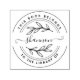 This beautifully crafted stamp features three concentric circles, framing your custom text in refined, round typography for a timeless look. At the centre, your name gracefully cuts through the circles in an eye-catching, handwritten script, adding a personal and artistic flair. To complete the design, two delicate hand-drawn leaves elegantly decorate the top and bottom, bringing a subtle natural charm.