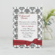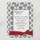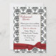 Elegant wedding rehearsal dinner invitation done in a black and white damask pattern, with a framed white text area, in the middle. Graphics of a pretty red ribbon and bow, decorates the bottom of the invitation. Text in black and dark red is ready to personalise for your event.
