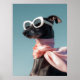 A sleek dog poses confidently against a clear blue backdrop, wearing oversized white sunglasses and a flowing pastel scarf. The smooth lighting highlights its elegant features while the accessories add a fashionable, modern twist. The composition blends minimalism with playful style, creating a chic and eye-catching portrait that captures personality, attitude, and effortless cool.