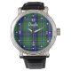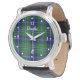 Stylish leather strap wrist watch, with the classic blue, green, and white clan Douglas tartan plaid pattern, on the face, with white numbers and dots for the hours. White custom text reads Abercrombie, and can be personalised to read what you want.