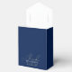 This stylish elegant favour box has a flower themed design with a vintage illustration and a cute little bird and a modern handwritten name, all on a dark navy blue background.