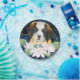 Stylish, unique paper plate with adorable St.Bernard dog puppy, flowers and faux golden confetti on elegant dark background.