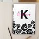 This is a chic and modern customisable notebook that beautifully combines personalisation with style. The cover is adorned with a large, bold letter “K” in black, overlayed with the name “Kristina” in an elegant, cursive font rendered in a striking pink hue. This personal touch adds a unique charm to the notebook, making it a perfect gift for someone special or a stylish addition to your own stationery collection. The lower half of the cover is decorated with an array of black Monstera leaf silhouettes, offering a trendy and organic aesthetic. The Monstera leaves, known for their distinctive shape, add a touch of nature to the design, making it feel fresh and lively. The white background provides a clean and minimalist canvas that makes the other elements pop, creating a visually appealing contrast. This contrast enhances the readability of the text and the visibility of the design elements, making them stand out.