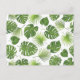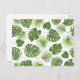 A postcard with a pretty pattern made up of green tropical leaves. Exotic and stylish design.