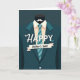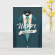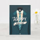 Designed with a minimalist graphic style, the card centres on a neatly tailored suit jacket, collared shirt, and striped necktie, giving a polished Father’s Day look 👔. The suit is a deep petrol blue against a moody teal background, making the lighter shirt stand out like a gentle highlight. A cream-coloured shirt sits under the jacket, and the tie runs diagonally with stripes in aqua and deeper teal, adding a calm rhythm to the design. Soft shadowing between the layers creates a cut-paper effect that feels tender and close, like a quiet nod of appreciation from one person to another 👨. Just above the collar, a small white moustache floats in place, suggesting a friendly, approachable dad figure. The word “HAPPY” appears near the top in white flowing lettering, while “father’s DAY!” sits across the chest inside a pale pink banner. The banner stretches slightly from one side of the jacket to the other, with the pink tone contrasting gently against the blue suit and teal background.