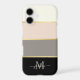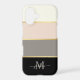 Cover your phone in a fashionable case featuring chic modern stripes in black, gray, blush pink and creamy eggshell white. Thin faux-gold lines separate the colors in designer style. A text template is included to personalize with your name and monogram initial. When personalizing the name in script, be sure to leave the leading and trailing boxes before and after your name. These cause the swashes at the beginning and end of your name to appear and add style to the name.