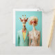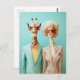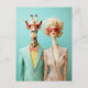 A surreal pop-art style image featuring a giraffe and a glamourous woman dressed in elegant, vintage-inspired outfits. Both wear oversized red sunglasses, exuding high-fashion charm against a pastel turquoise background.