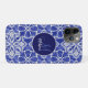 Elegant blue initial monogram iphone case. This blue design features your monogrammed initial and last name in light grey modern typography printed on a patterned geometric blue grey background. This trendy elegant design is perfect for your bedroom, family room or living room. Personalise this stylish pillow with your family's monogrammed initial and last name to create your own custom throw pillow. You can change all text colours and fonts, click to customise further underneath the text customisation area this will take you into the design tool. A unique gift for birthday, holidays and any special occasion. Whether for valentines day, Christmas or as a gift in general it makes a great gift idea