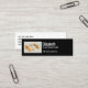 Mini business cards with an illustration of a pair of gold koi fish swimming together. Black background.
