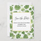 Save the date card with a pretty pattern made up of green tropical leaves. Exotic and stylish design.