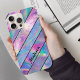 elegant holographic chic blue pink striped iPhone 16 Case. This iPhone case is designed with abstract, holographic stripes that reflect a dynamic range of colours, from teal to lavender to rose. The subtle, shimmering stripes create a radiant, otherworldly vibe, giving the case a refined and stylish iridescent finish.