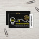 A black and white layered cover features a creative home electrical wiring circuit design. The circuit is drawing power from your prestigious name on the right side of the card in a white stripe layer. Beside your name is a gold letter-e logo you can use. ; The letter-e can represent "electrician", your prestigious name, business name etc. Just below this is the business name in yellow and its contact details.