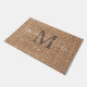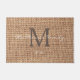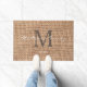 Stylish initial and script text family name burlap doormat.