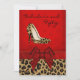 Stylish lady's birthday or event invitations done in a brown and black spotted jaguar fur pattern, with elegant graphics of matching animal print stiletto high heels, decorating the red on red floral background, on the top front. Red satin looking ribbon and bow acts as a decorative border between the red background and the jaguar pattern. The back is done in same jaguar pattern, with a red framed white text area over top. All text, front and back, is ready to personalise for your event. Fabulous looking invitation.