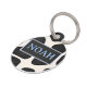 A modern pet ID tag with a white background and solid black leopard spots. The front showcases a black name panel outlined with blue lines, with your dog’s name displayed in blue lettering. The back features a black background with blue text for a customisable contact message and phone number. Clean, high-contrast, and designed for everyday safety.