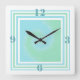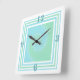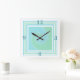 Stylish decorative square wall clock, with graphics of a aquamarine, mint green, and white boxed off frame, around a swirl design, in the middle. Numbers in a aqua stencil look finish off this pretty clock. Great in any room of the house or office. Customize if you want to add text.