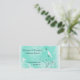 Elegant business card, with stylish floral flourishes, in white and teal, against a mint green background, with a white silhouette of a bird sitting on the tip of a leaf. Text in teal is fully customisable to suit your business needs. Lovely card suitable for many different occupations and businesses.