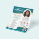 Marketing flyers are a great way to advertise your notary business and attract new clients. This stylish design showcases your photo inside a circular frame, with an elegant gold gradient. Personalise the template with your name, credentials, contact information, accreditation logos, services, and a convenient appointment-scheduling QR code. The text can be customised to suit your business. Perfect for a Notary Public, Loan Signing Agent, Mobile Notary, Certified Notary Trust Delivery Agent (CNTDA), Apostille or other legal profession. Printed colours: blue-green, teal, gold, black and white. Shop the online collection for more popular product ideas and supplies, designed for notaries!