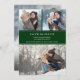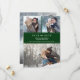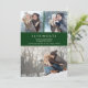 This modern save our date card offers a photo collage consisting of 3 photos on the front and 1 large photo on the back. The background is a stylish emerald green with white text. Extra text, on the back, allows for additional information.