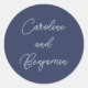 Stylish Modern Script Wedding Names Navy Blue Classic Round Sticker