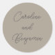 Stylish Modern Script Wedding Names Taupe Grey Classic Round Sticker