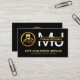 An all black cover is accentuated by a placard with faux gold borders near the top right corner of the card. This gold placard has your job title with your monogram name initials at the back. To the left is a gold chauffeur logo you can use with the business name and a slogan caption at the base. ; You can change the caption remarks to the slogan to suit your own service needs.