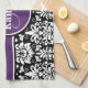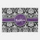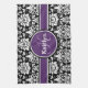 Elegant, feminine, floral damask background pattern in black and white with a customisable name label frame in purple for your monogram initial letter and personalised name.