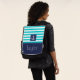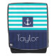 Nautical backpack with turquoise & navy blue striped pattern and customisable text.