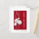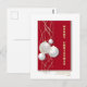 A sophisticated Merry Christmas postcard featuring white and gold hanging ribbons and ornaments on a red and white background for you to share the joy of the festive season. Customize your details in the information provided below the image.