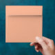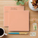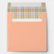 Pretty peach coloured square invitation envelope with a neutral pastel plaid pattern lining the inside. Dark grey custom return address is ready to personalise, on the back flap. Lovely finishing touch to our Plaid Couple's baby shower invitation.