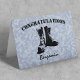 A simple military passing out greeting card featuring, the word "congratulations", a pair of military boots in silhouette and the name of the soldier. The text font styles, size and color can be changed by clicking on the customize further link after personalizing.