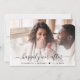 Modern light cream save the date announcement featuring your photo overlayed with "happily ever after" in a stylish script with swashes and your names and wedding date joined together with a heart. On the back, personalise your announcement in elegant typography and and input your wedding website address to create a QR code for your guests to scan for wedding updates and details.