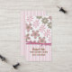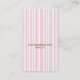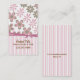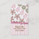 Pretty mummy networking card done in pink and brown flowers, against a white background, on the top, and a pink and white striped design, on the bottom and back of the card. Graphics of a decorative pink ribbon runs across the front dividing the different backgrounds. Brown text, on the front and back of the card is fully customisable to say what you want. Great looking mummy card, that's great for arranging play dates, with other moms, and baby sitting co-ops.