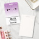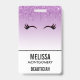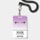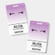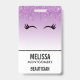 Name badge with a trendy stylish design. The background is a purple gradient colour with an image of fake sparkling glitter dripping down from the top. A pair of girly cute eyelashes underneath the glitter image.