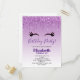 Birthday party postcard with a trendy stylish design. The background is a purple gradient colour with faux sparkling glitter dripping down from the top. A pair of girly cute eyelashes underneath the glitter.