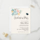 Graduation invitation with a pretty watercolor illustration. A flower bouquet with pink and blue flowers surrounded by green leaves and sprigs.