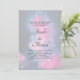 Wedding invitation with a beautiful abstract design in pink and blue. White stars sprinkled throughout this image of the cosmos. A semi-transparent layer placed over top to give it a faded elegant look.