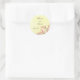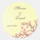 This trendy personalised wedding round sticker has a beautiful pink cherry blossom design on the right with a pink hummingbird silhouette towards the middle of the flowers. In the background, there is a soft yellow colour with a faint swirl design at the bottom. You can easily customise the name of the bride and groom along with the date of the upcoming wedding ceremony. This would be suitable for a spring or summer wedding!
