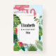 Personalised name badge with a cute and whimsical pink flamingo. Surrounded by green tropical leaves, and red and yellow hibiscus flowers. A rectangle shaped, gold gradient frame in the centre.