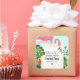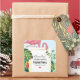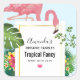 Candle or soap stickers with a cute and whimsical pink flamingo. Surrounded by green tropical leaves, and red and yellow hibiscus flowers. A square gold gradient frame in the centre.