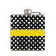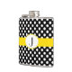Stylish feminine flask done in a black and white polka dot patterned, with a bright yellow band, around the middle of the flask. Graphics of a yellow scalloped edge oval white monogram plaque, on the middle front of the flask, has a black one letter monogram. Personalise the monogram for yourself or as a lovely gift idea.