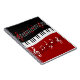 A cool and eye-catching piano music design featuring piano keys in a waving motion in the centre with red, black and white musical notes scores above and below in alternating colours.