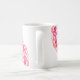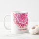 Beautiful mug with a custom name and an original Bohemian Boho Mandala design, pink and red on a white background.