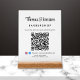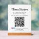 White acrylic tabletop sign featuring your name showcased in a stylish signature script and business type in simple modern lettering. Input your website address to create a scannable QR code for customers and clients to see your products, services, hours, etc. Add your instagram and facebook user ids for customers to follow you on social media.