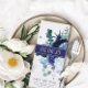 This elegant soft blue and grey design features an blue ribbon like band, gum leaves, hydrangeas, peonies and thistle in a boquet. It is a semi-formal, easily editable design which is fresh, vibrant and modern, but also suitable for a more rustic wedding or occasion.