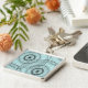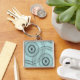 A stylish modern swirly zen doodle Spirograph style pattern in black and turquoise blue on a stylish key chain/bag fob