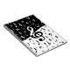 A stylish and eye-catching pattern of random musical notes in black and white with a large treble clef in the centre. The bottom of the design features black music notes on a white background with the top featuring white music notes on a black background. The large clef changes from black to white in colour half way.