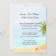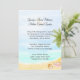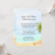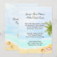 Stylish beach theme wedding invitation. Lovely painted like graphics of a sandy beach scene, with sea shells, star fish, sand dollars and palm tree, at the bottom of the invitation, and a colourful blue and aqua background, over the rest of the invitation. The back has the same pretty beach graphics with two halves of a clam shell, together. Text in black is fully customisable to personalise for your special day. Great for beach destination weddings.