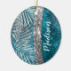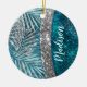 Stylish turquoise silver glitter leaves monogram ceramic ornament